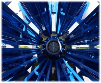 Großrindwickler zum aufwickeln von Kunststoffrohren mit einem Durchmesser von bis zu ø200mm. Die Trommel besteht aus 8 Segmenten, welche einzeln aus Fachwerken bestehen. Diese Fachwerke übertragen die Lasten auf den Tragstern, sodass keine vordere Abstützung notwendig ist. Die Trommel kann stufenlos im Durchmesser verstellt werden, sodass ebenfalls nach erfolgter Herstellung des Ringkörpers, der Kerndurchmesser verringert werden kann und der Ring leicht entnommen werden kann.